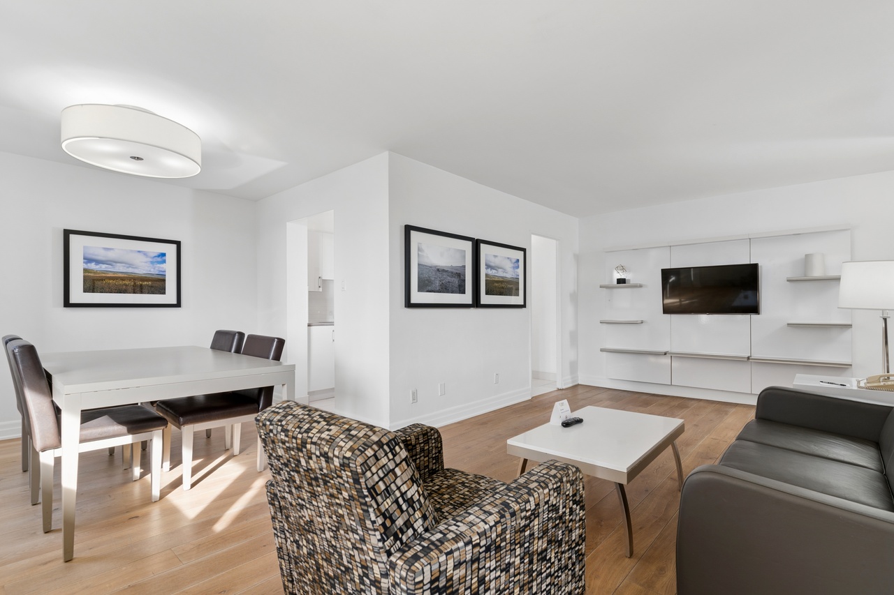 This two-bedroom suite in Toronto includes one bedroom with a king bed and a second bedroom with two double beds, offering flexibility for families or multiple adults traveling together. Separate living and dining spaces create room to gather, work, or unwind while maintaining privacy in dedicated sleeping areas.